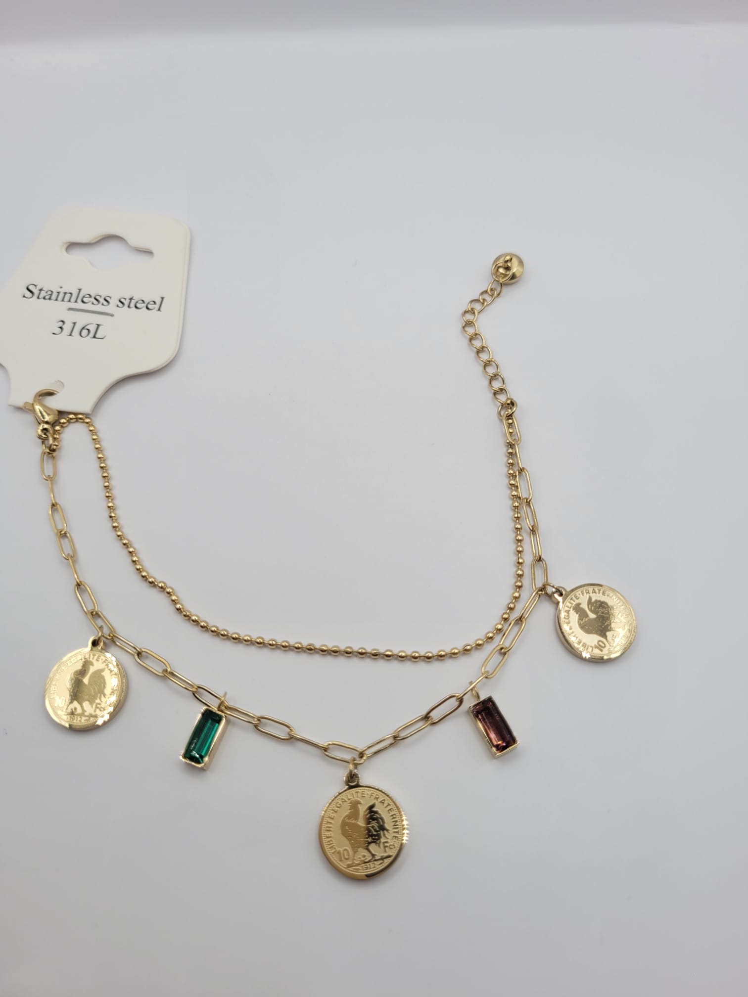 Double Bracelet Acier Inoxydable Reine Elisabeth Doré avec Pierre Verte :